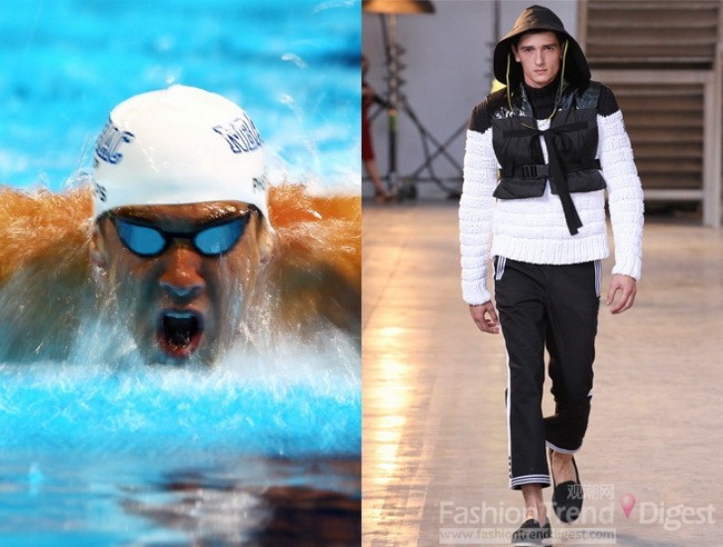 2. Moncler的这款造型灵感来自游泳选手 Michael Phelps在比赛中的造型,白色游泳帽、蓝色游泳眼镜和碧蓝的池水,设计师在男士的白色毛衣上增添了黑色护胸设计,肩领附近采用的黑色毛线相拼接,下身搭配黑色白条纹运动长裤,在急剧寒冷的冰山里也能感觉丝丝暖意。
