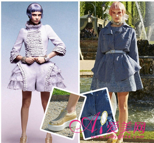 小编解析:虽然有点过于夸张,但可说是甜美女孩气伞状连衣裙趋势代表,大裤裙的设计和粉蓝粉绿淡彩色令人印象深刻。膨大的裙摆夸张了臀部的线条,宽大的裙口使得大腿看起来更加的纤细,一双增高鞋可以搭配成清爽的效果,而腰部腰带更起到美化曲线的作用。