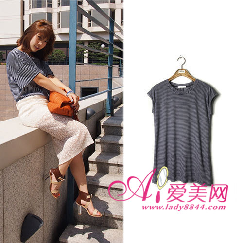 小编点评:清新感十足的细条纹T恤,深蓝和白色的相间有种沉稳的气质感,宽松的小板型和圆领,简单而修身,百搭又时尚感强。