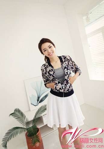 花朵图案棒球衫内搭灰色背心MIX白色A字裙