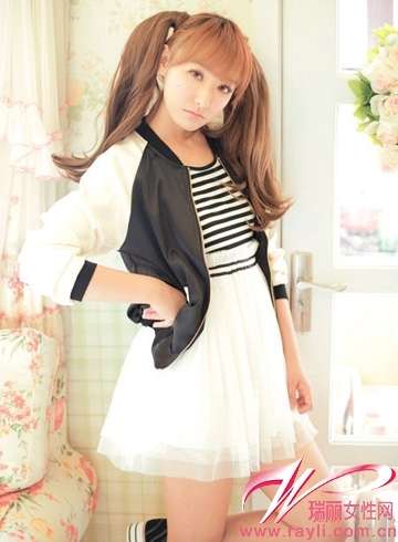 黑白插肩设计的棒球衫内搭横条纹T和白色高腰纱裙