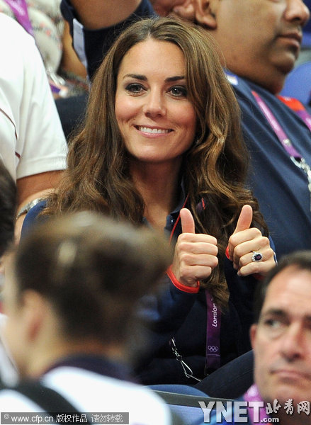 伦敦,当地时间8月5日,2012伦敦奥运会第9日体操,王室观战,凯特王妃(Catherine, Duchess of Cambridge)笑容迷人,双手举大拇指。当天英国选手Rebecca Tunney参加男子体操鞍马项目决赛。