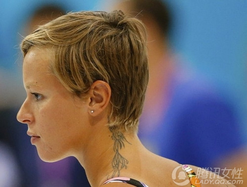 意大利自由泳名将佩莱格里尼(Federica Pellegrini)在聆听教练对赛前的叮嘱,在利落的精灵短发下,我们在她的耳朵上的耳钉和脖子上漂亮的纹身图案,看来奥运赛场上充满着无数个时尚的元素。