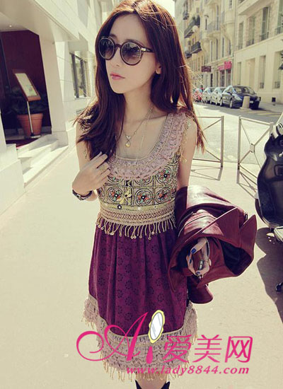 无数的花边 + 刺绣,奢华和惊艳并存的一款民族风连衣裙。再加上紫色的浪漫,更好地诉说了风情万种。单穿或搭配外套都很赞的哦!爱漂亮的MM快点来试试吧!