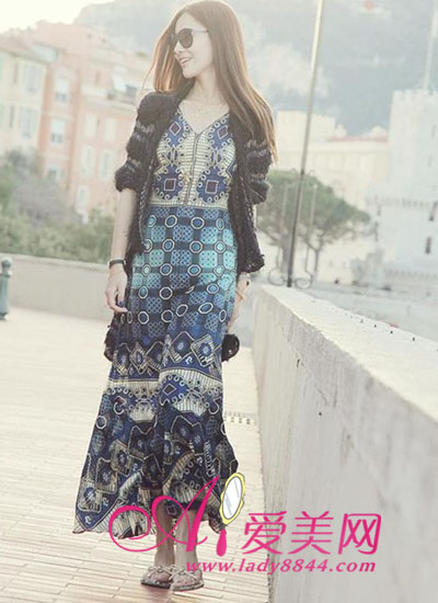 大V领的设计,露出性感的锁骨。波西米亚印花,增添了浓郁的复古韵味。飘逸的吊带长裙,穿出美轮美奂的民族风,仿佛走进一副优雅的画面,让人心动。