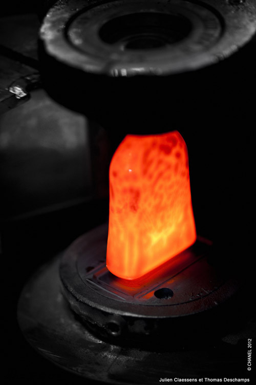沙粒,苏打灰,石灰与碎玻璃的混合物是制作这款香水瓶的原材料,经由1600°C的高温加热后,形成的液态玻璃被注入可可小姐黑色香水瓶身的模具中。