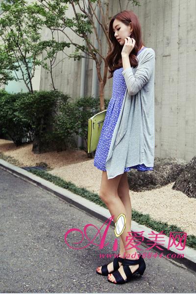 灰色中长款大下摆针织开襟衫+蓝色小碎花连衣裙