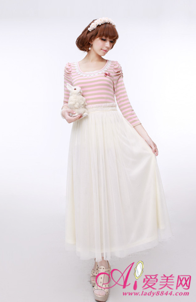 超修身的一款,圆领包边,拼接精致花边,肩袖上车缝橡筋,形成公主袖,胸前一个海军风的蝴蝶结,点睛之笔。腰节处拼贴两行缎带,网布在外更增添甜美气息,长长的裙摆让人着迷不已。