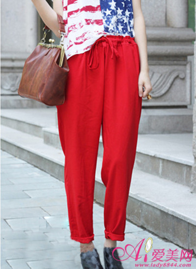 大红色总是给人喜气洋洋的感觉。简单的剪裁,加上抽绳设计,总体简洁的款式也让这款哈伦裤成为女生们的搭配好帮手。搭配花色的