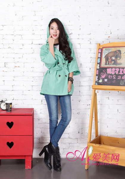 薄荷绿短款风衣