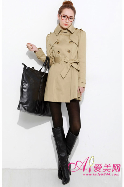 军装风的卡其色,经典双排扣,小方领非常端庄,蝴蝶结腰带更修腰身。