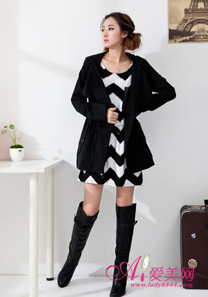 黑色风衣显瘦指数更高,同样可以进行帅气的演绎,里面搭配的黑白波浪条纹连衣裙,效果非常协调。