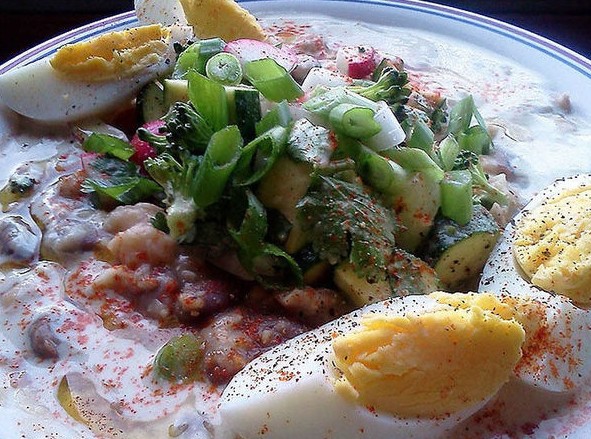 埃及早餐这里选择了Foul Madamas作为埃及早餐,它由蚕豆,鹰嘴豆,大蒜和柠檬共同制作而成。图中你看见菜中的有橄榄油,撒了辣椒,芝麻酱,煮蛋和一些绿色蔬菜丁儿。