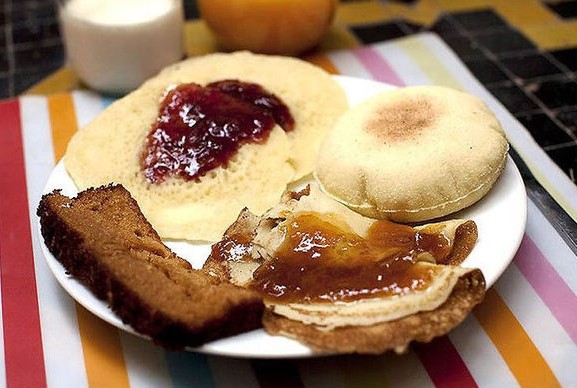 美味的摩洛哥早餐通常包括涂有些酸辣酱,果酱,奶酪或者黄油的不同面包。摩洛哥有真正美味的烤面饼,通常被一厚块端上来,然后你从上面撕下一点儿来,还有叫做Baghir的小麦粉薄烤饼--它们都很好吃。