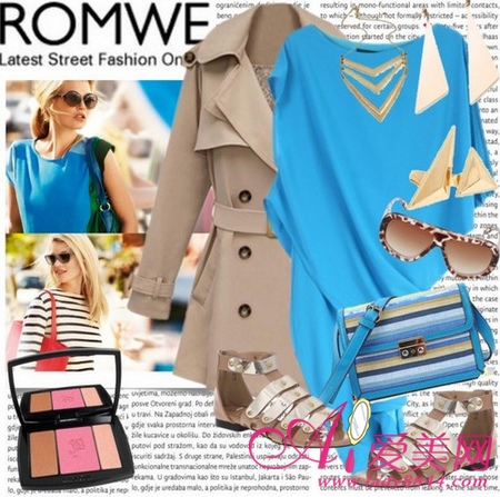 宽松的蓝色连衣裙纯净而性感,外搭卡其色风衣外套抗风保暖,增添女人味。
