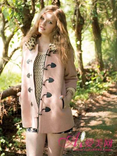领子有动物纹样毛毛质地,给人一种张扬个性感觉,扣子带点复古风,随行自然装扮。