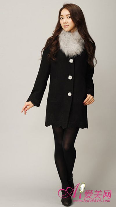 秋冬当然是黑色经典为主,扣子花朵设计和皮草围巾成了全身黑色装扮突出之处。