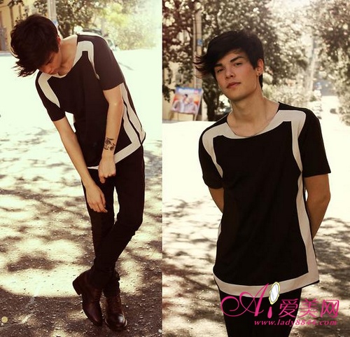 男士的黑白配可不是只有白衬衫+黑裤子哦,简约的拼色T恤搭配上修身牛仔裤,简约风格走起。