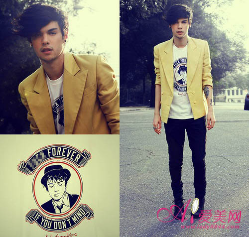 白色T恤搭配黑色牛仔裤是平时的简约风装扮,但是加上一件卡其色的西装就不一样了,绅士帅气感马上显露无疑。