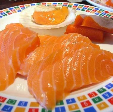 日本人称生鱼片为“沙西米”。一般的生鱼片,以鲣鱼、鲷鱼、鲈鱼配制,最高档的生鱼片是金枪鱼生鱼片。开宴时,让你看到一缸活鱼,现捞现杀,剥皮去刺,切成如纸的透明状薄片,端上餐桌,蘸着佐料细细咀嚼,滋味美不可言。不吃生鱼的外国人,尝了一次便想吃第二次了。