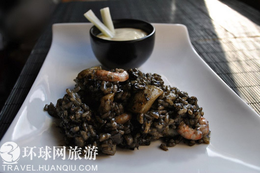 西班牙人在吃黑饭时一般总在饭上面浇一点柠檬汁,加一点酸味可以减一点腥味。在吃海鲜黑饭的同时也叫一份生菜,这样有荤有素。