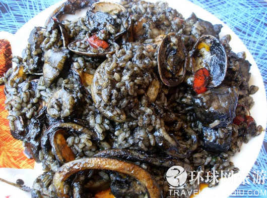 据说数百年前西班牙的无敌舰队在征战中南美洲时,有一次炊事员已经用完黄色粉末,又一时无法购买,炊事员干脆把原本准备扔掉的墨鱼汁来替代黄色粉末。黑色海鲜饭做好后连厨师自己也不敢相信其味居然如此之美、之鲜。早就饿急了的士兵将黑饭一扫而光,炊事员还受到了嘉奖。打那以后,墨鱼汁海鲜饭不仅写进了西班牙的传统菜谱中,还经过各地厨师的改良变得更加受人青睐。