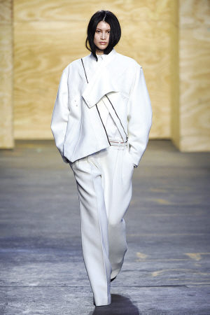宽大的斜襟白色上衣和利落的直筒裤,这一身copy的正是空手道服。设计师在细节之处也未马虎,连纽扣也是严格地使用了白色。(ProenzaSchouler·中国名模 何穗)