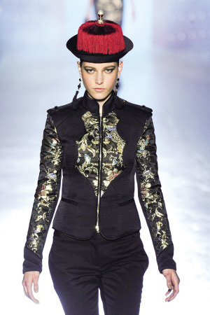 这不是僵尸来了,是亚裔设计师Jason Wu在本季秋冬系列上推出的经典造型。或许是有着近水楼台的优势,Jason Wu对于中国元素的把握,显得游刃有余。清官的官帽、祥云密布的裙装,以及大量华美的刺绣,T台在刹那间穿越至了清代。(Jason Wu)