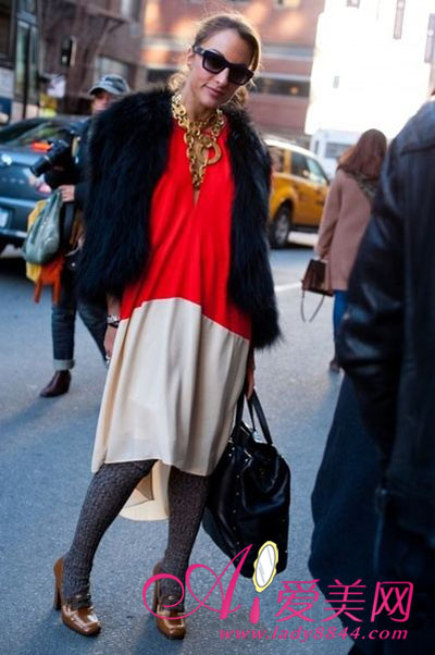 深紫色厚重皮草超有名媛感觉,搭配拼色连衣裙很抢眼。