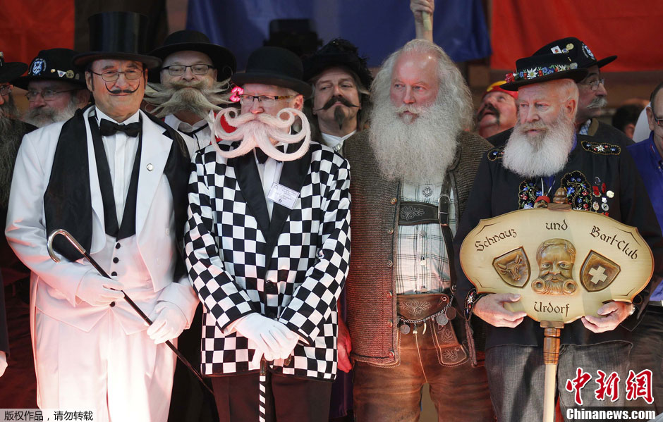 当地时间9月22日,法国维特斯多夫,来自欧洲各国的100多名“美髯公”聚集在此,角逐2012年欧洲胡须锦标赛冠军。参赛者们为自己设计了各种各样的“胡型”。不仅如此,为了衬托胡子,参赛者的装扮也是千奇百怪。