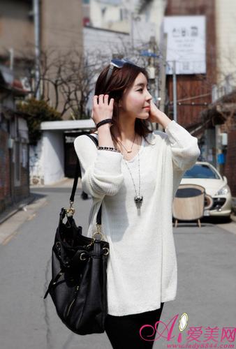 搭配Tips:白色宽松休闲针织衫+黑色打底裤
