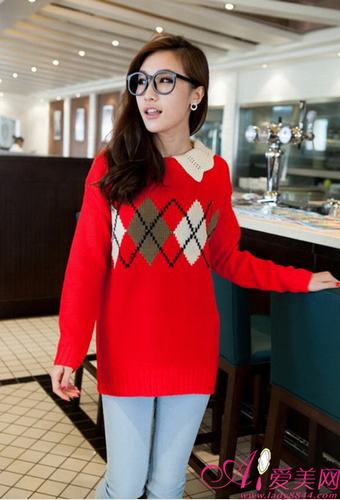搭配Tips:撞色菱格娃娃领针织衫+紧身裤