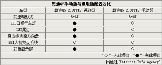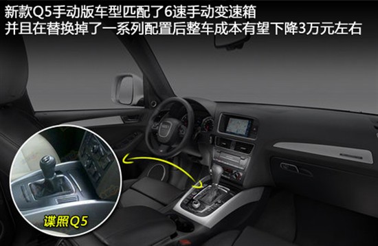 为了进一步降低准入门槛并丰富车型产品线,更入门的手动低配成为了新Q5的一个看点。低配版在大灯的内部并没有采用与现款相同的LED日间行车灯结构,尾灯也同样采用非LED式的设计。而在售价方面手动档奥迪Q5在更换了手动变速箱、更换了卤素前后灯组和真皮多功能方向盘后,其整车成本大致能够下降3万元左右。