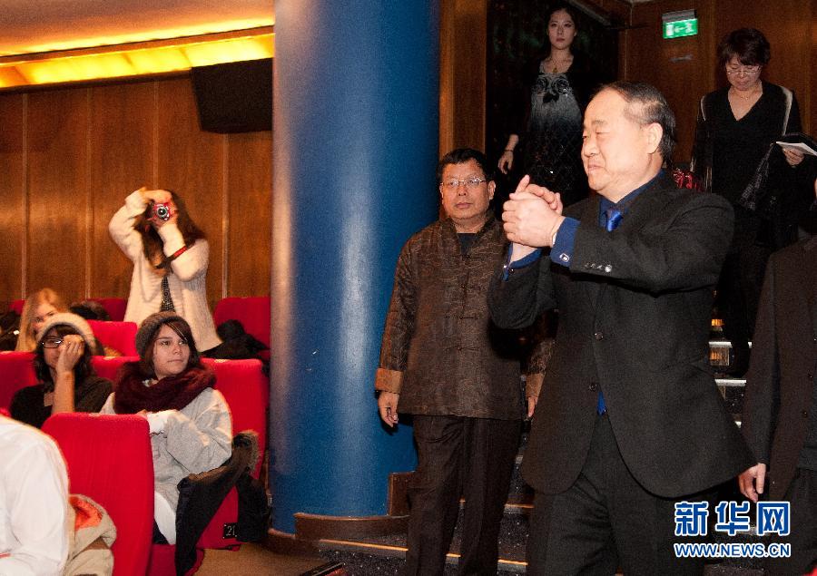 12月9日,在瑞典首都斯德哥尔摩,2012年诺贝尔文学奖得主、中国作家莫言向观看电影《红高粱》的瑞典大学生和中国留学生致意。新华社记者刘一楠摄