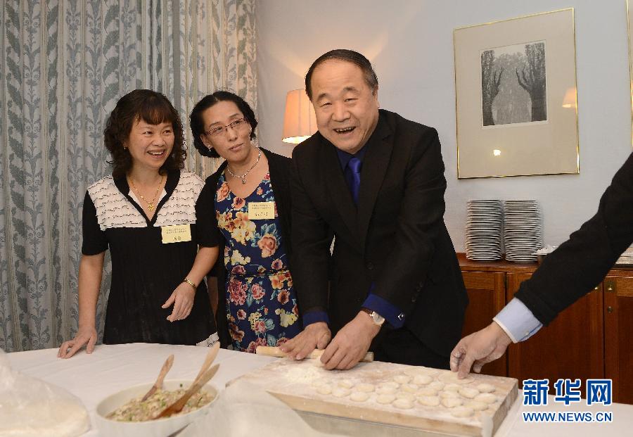 12月9日,在瑞典首都斯德哥尔摩,2012年诺贝尔文学奖得主、中国作家莫言(右)在当地华人华侨举办的欢迎宴会前与众人一起包饺子。新华社记者武巍摄