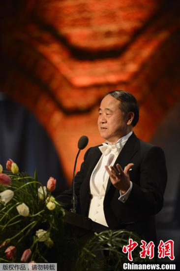 北京时间12月11日凌晨,2012年诺贝尔奖颁奖仪式在瑞典斯德哥尔摩音乐厅隆重举行。0点16分许,中国作家莫言正式领取了今年的诺贝尔文学奖,并在随后参加了盛大的诺贝尔晚宴。图为莫言在诺贝尔晚宴上致辞。