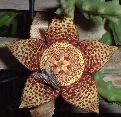 它长得有几分像大王花,却被苍蝇出卖了尺寸,其实这只是夹竹桃科萝摩亚科的腐肉花,Orbea variegata,也很难闻。它们这个样子倒是和大王花一样,为了吸引苍蝇授粉。