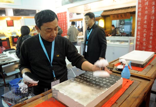 12月20日,北京石刻艺术博物馆的工作人员在进行碑帖拓片展示。