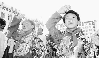 青海玉树第一民族中学的学生在新校园中举行开学典礼。徐海鸿摄(新华社发)