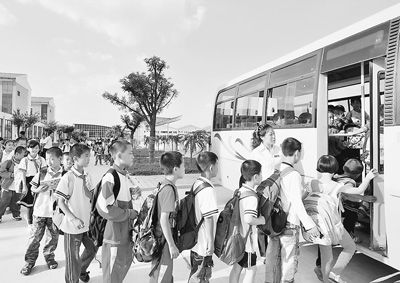 山东邹平县鹤伴小学的学生乘坐免费校车。董乃德摄