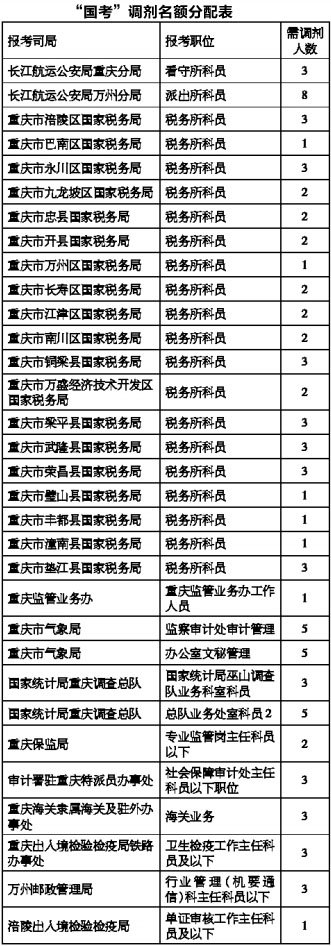 据悉,32个调剂职位分别来自交通部长江航运公安局重庆分局、交通部长江航运公安局万州分局、国家电监会华中监管局重庆监管业务办、重庆市邮政管理局、中国保险监督管理委员会重庆监管局、国家统计局重庆调查总队、重庆出入境检验检疫局、重庆海关、重庆市气象局、重庆市国家税务局、审计署驻重庆特派员办事处等部门,其中重庆市国家税务局调剂职位达19个,约占本次“国考”调剂职位的2/3。据悉,32个调剂职位共提供85个调剂名额。
