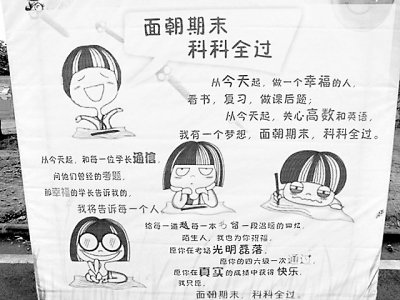 记者看到,展板上的漫画形象地再现了考试季学子埋头苦想、奋笔疾书、考试胜利等状态。同时漫画配以脍炙人口的海子诗歌《面朝大海,春暖花开》中文字的格调,这给紧张备考的学子带来了轻松感。