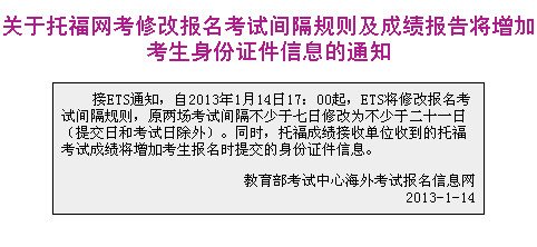 据托福报名官网1月14日显示,ETS发出了关于托福网考修改报名考试间隔规则及将成绩报告增加考生身份证件信息的通知,具体内容如下: