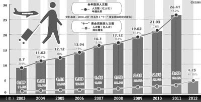 近十年“十一”黄金周旅游人数增长与国内旅游人数增长比较图表。CFP