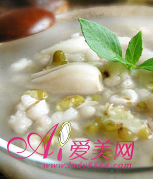 糯米百合甜杏粥。糯米100克,百合30克,甜杏仁20克洗净同煮为粥。