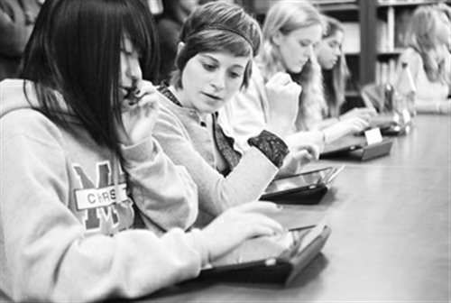科技走进课堂 美国学生用iPad上英语课 美国加利福尼亚州沃森维尔,一所学校的学生在英语课堂上使用iPad平板电脑学习。