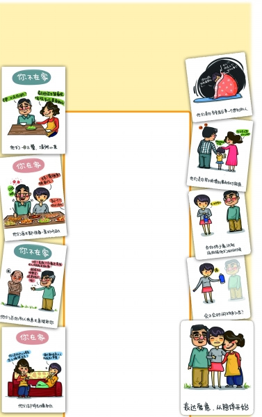 在外面,女儿是个精明能干的员工。在家酣睡时,总有爸爸妈妈来到床前端详你的模样,为你盖被子。“他们是你受委屈时最先想到的人,他们是你拼搏的最初动力能源,你的软弱最不怕他们看到。”抒情文字让漫画更令人感动。最后,漫画情节一转折:后来,他们的记忆越来越不好,听力也越来越差。我跑得越来越快,却没注意到他们越走越慢,你越来越强大的同时,他们也越来越老。你习惯了他们存在的日子,竟然忘记了他们也会……离开。漫画最后讲述了爸爸拧不开饼盖子,女儿帮他的故事,没想到爸爸身躯从开始彩色实物变成后来虚幻的影子,伴随着的是一句:当你想孝顺的时候会不会时间不够了呢?“所以,趁现在一切都来得及,快回家吧,表达爱意,从陪伴开始。”