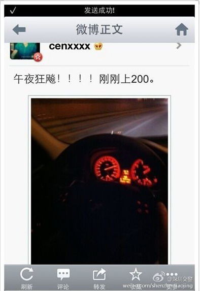 今日据深圳市公安局交警支队的官方微博消息,昨日凌晨微博上名为“cenxxxx”的网友晒出一张“汽车超速200”的照片,被深圳市公安局交警支队的官 方微博@深圳交警随即发现并告诫“严重超速等于自杀!请立即减速,我们会依法调查。”该网友随后删除了此条微博,仍被较真的@深圳交警截屏作为证据保存, 并表示明天等待的将是法律制裁。