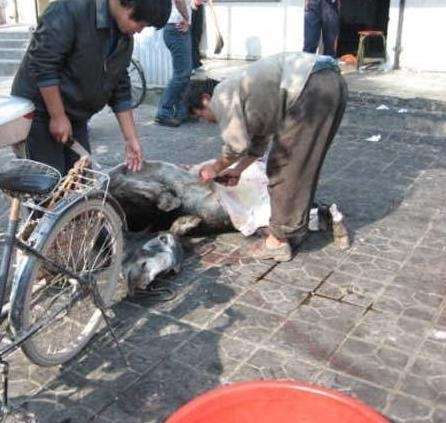 这道菜也是和驴过不去,活驴固定好,旁边有烧沸的老汤。食用者指定要吃某一部分,厨师剥下那一块的驴皮,露出鲜肉。用木勺舀沸汤浇那块肉,等浇得肉熟了再割下来,装盘上桌。