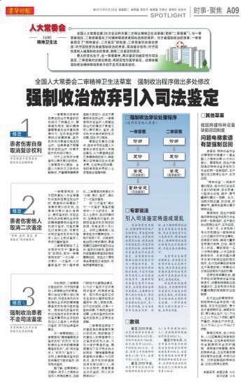 全国人大常委会第二次审议精神卫生法草案。草案二审稿再次对备受关注的强制收治程序做出重大修改,确定强制收治精神障碍患者今后不走司法鉴定途径。